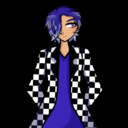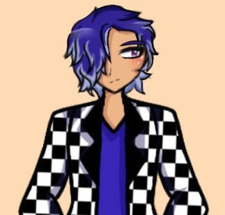 Main outfit: royal blue shirt, black slacks, a black and white checkered jacket