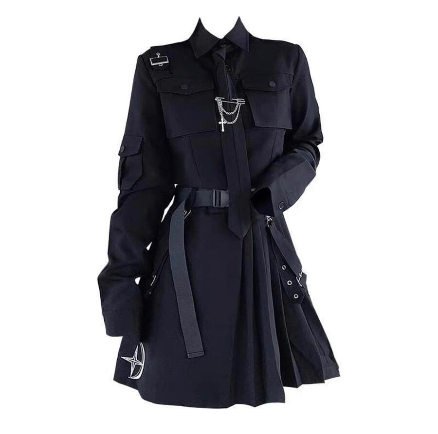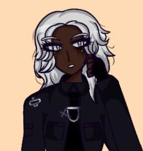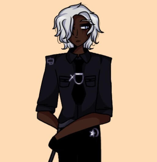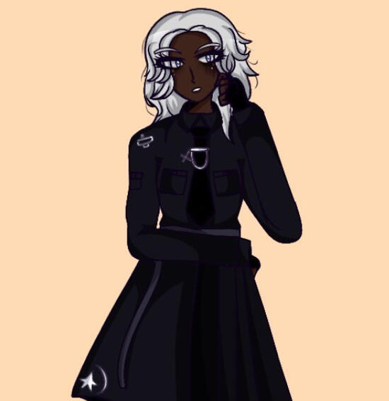 Main outfit: black 2 piece containing a cropped blazer (+tie and tie chain), and a skirt with a star and crescent emblem on the bottom left (see Reference 1), black fingerless gloves