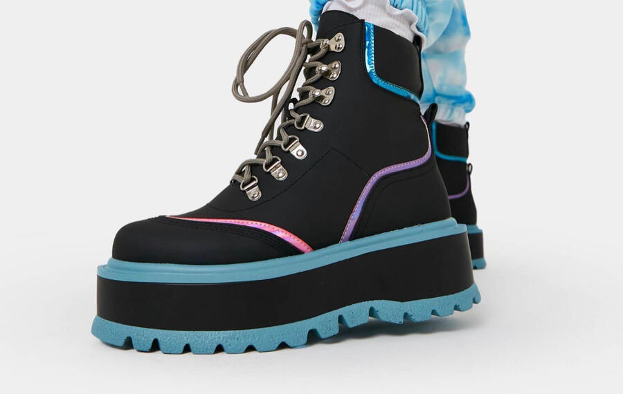 Main footwear: black platform boots with blue, pink and purple decor (see Reference 2)Masc Design: